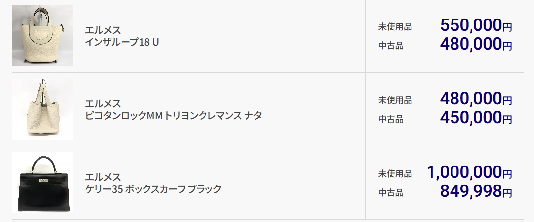 エルメス | ケリー35 ボックスカーフ ブラック | 未使用品:1,000,000円 中古品:849,998円 |
