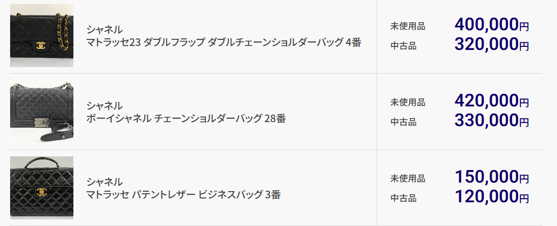 シャネル | ボーイシャネル チェーンショルダーバッグ 28番 | 未使用品:420,000円 中古品:330,000円 |