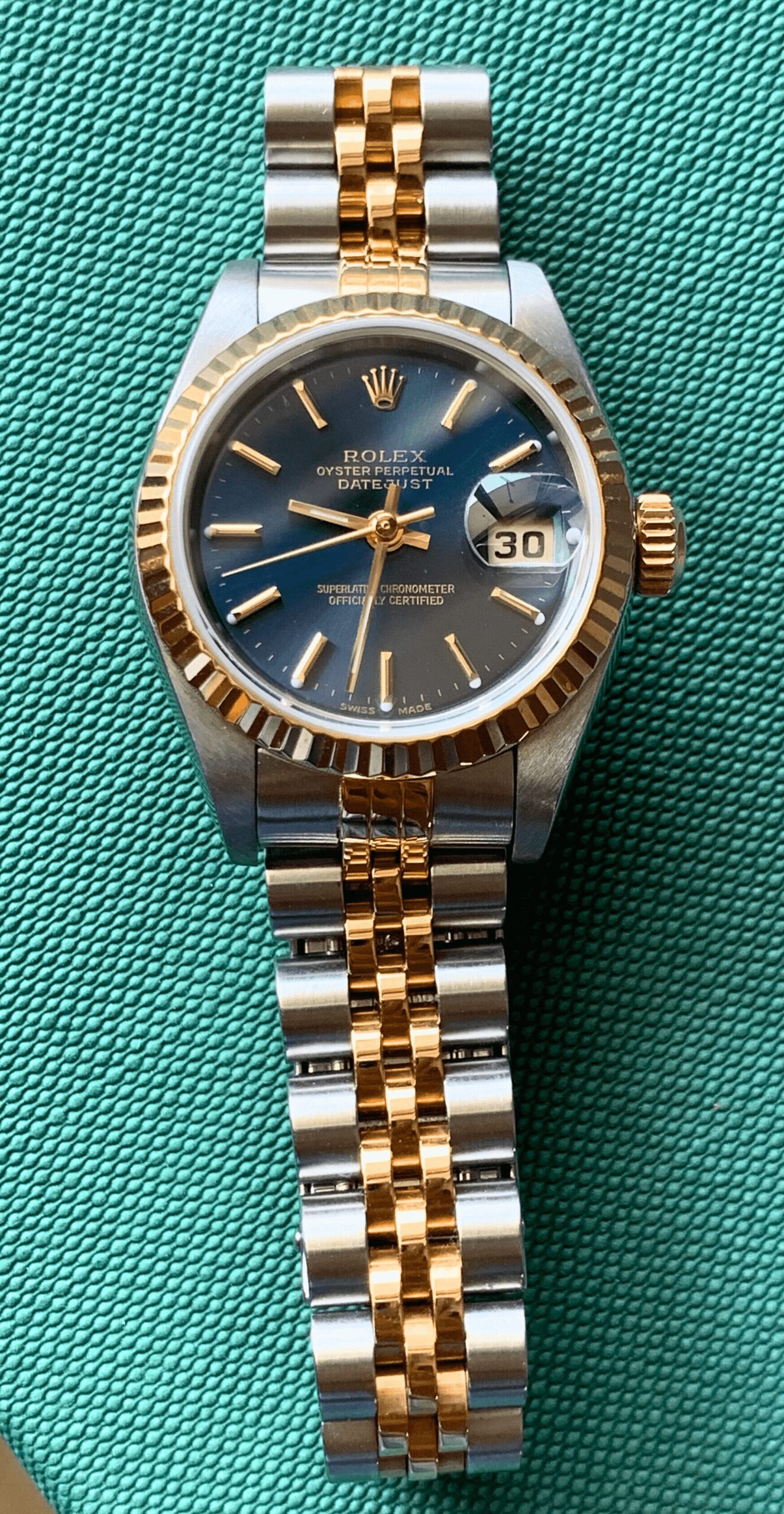 私が査定に出したのは「ロレックス デイトジャスト79173(青文字盤)」。